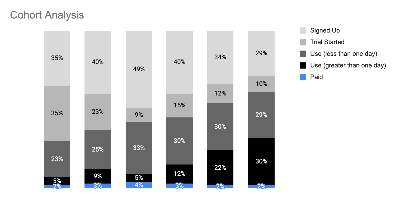 The percentage of Trial usage has been increasing each period (shrinking Signed Up and Trial Started cohorts, and growing Use cohorts)