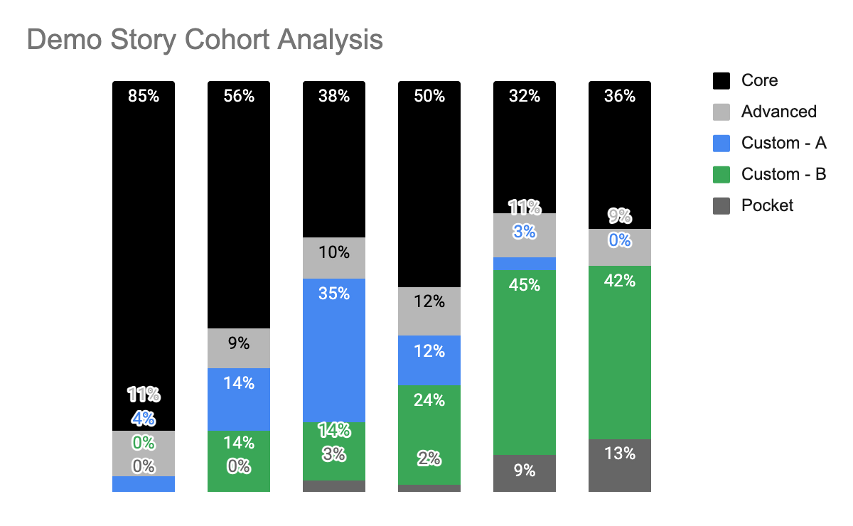 Demo Cohort Analysis —The successful use of varying demo story/scripts in converting to next steps (scoping, eval etc) over six periods. The core demo loses impact, perhaps competitors have found ways to preempt the messaging, beginning in P2 leading to alternative options. Custom A‘s growing success looks to supersede Core however loses favor in P4. Custom B supplants Custom A on P6.