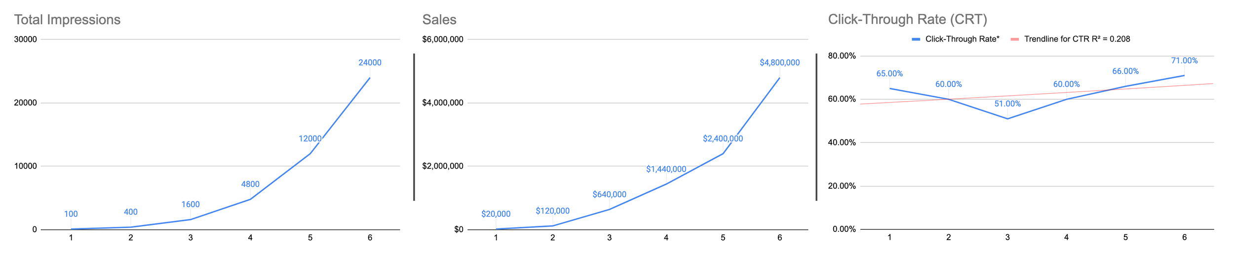 To illustrate my point, take a look at the following hypothetical set of data highlighting three KPIs: product impressions, sales, and click-through rate. Revenue and impressions are structured in the triple-triple-double-double-double pattern we like to see in ideal early-stage company growth models. On the surface everything looks like a slam dunk, which is why we’re going to use cohort analysis on the same set of data to understand if our business is actually healthy and draw insights on improving it.