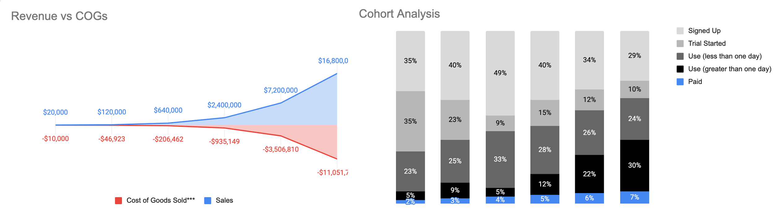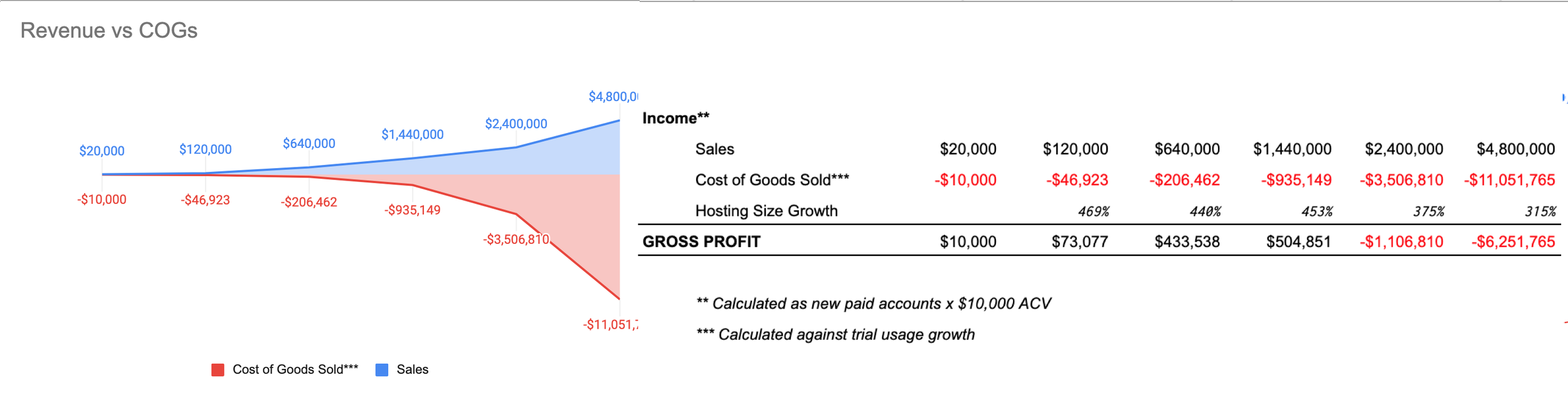 It doesn’t warrant imagining or investigating events that drove these behaviors, being a hypothetical scenario, just assume a marketing campaign in P3 drove signups and encouraged discounted purchases; followed by extensive feature release in P4, P5, and P6 led to more features to explore during trials. Cohort analysis explains that while a greater percentage of trials were being used, there was not proportional growth in paid customers. This was hidden from the vanity metrics because both Impressions and Paid customers were growing exponentially but significant revenue was being left on the table. Meanwhile, in fact, features developed to encourage trial use may have increased cost to host, support, and maintain across the free segment without receiving justifiable revenues in the paid. This becomes poignant once Cost of Goods Sold is factored in, proportional to the growth in number of trial accounts, to calculate gross profit. What was a comfortable $505k margin in P4 has become a ($1.1m) deficit in P5. (This is obviously a simple espousal of cohort analysis identifying a business challenge hidden behind vanity metrics.)