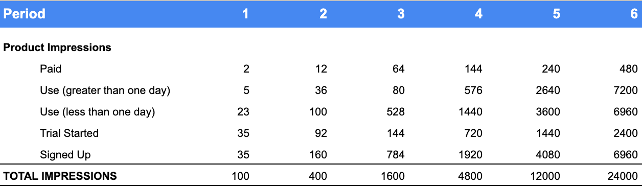 This visualization shows cohorts as the percent of total impressions in a given period. An increase from 2% to 3% in the P1 and P2 Paid cohort does not necessarily mean more customers signed on in P2, nor does it necessarily mean that less customers signed on in P4 when the cohort shrunk from 4% to 3%. But it does demonstrate that a greater percent of the total impressions in P2 paid compared to those in P1, even if P1 had one millions impressions and P2 just 100. This scenario is modeled with constant growth so you need only focus on changes to cohort size to interpret business patterns. In reality, your mileage may vary.