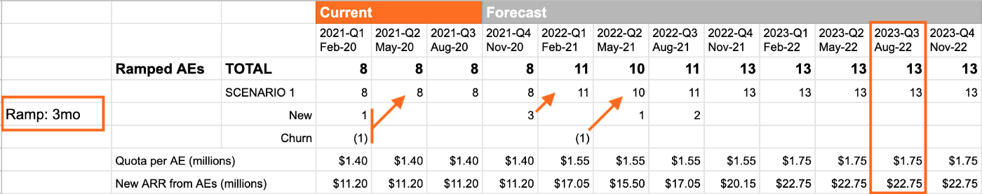 First, let me introduce a basic hiring plan sheet. The driving factor in this model is to double annual recurring revenue (ARR) within two years delineated from personnel growth. New hires and attritions are reflected in the following quarter due to the 3mo ramp time (for ease of demonstration). Quotas increase yearly and quarterly revenue forecasts are simply a multiplication of Ramped AEs x QTRQuota. For simplicity’s sake, I’m not including quota during the ramp period.