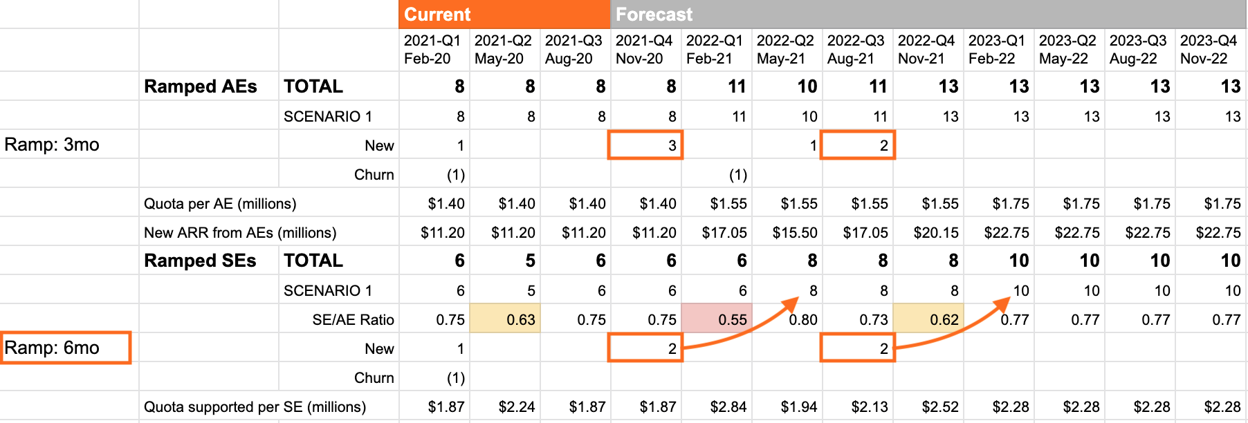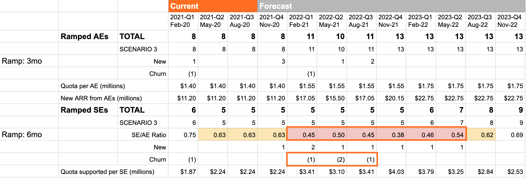 In this scenario, the SE leader hired alongside the growing sales team. When a member attrited in Q1–21, the hiring manager hired a backfill within the quarter. When sales increased their team, the hiring manager dutifully hired more. It sounds good on paper but this direct alignment creates stressful quarters due to the delta in time-to-productivity between AE and SE. First, it impacts new hires because they feel they’re not getting proper senior-level support from SEs and delays their ramp time. Second, it impacts tenured SEs because they’ll be stressed to provide support across more people, at least until the new SEs ramp. In the meantime, the existing SEs are on the hook for supporting nearly 50% more of the quota for the same OTE (note: in this example, SEs have a shared quota model). If AEs can’t hit their stride early on, they may also be at risk for attrition.