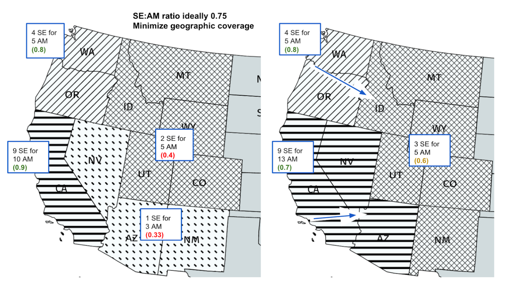 SoCal had some AM attrition in 2019 and became flush with roughly 4 SEs to every 3 AMs. Mountain was struggling to support the business of 5 AMs with increasing activity in Boise when their two SEs had to travel from Boulder and Salt Lake City. Desert had an SE in Albuquerque but was desperate for local presence in Las Vegas.