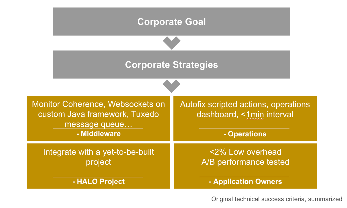 The responses this time were entirely different. Middleware aimed to reduce the time required to provision hardware and tooling, enabling developers to swiftly create new environments and conduct testing scenarios. Operations sought better information to address issues without escalating them to development teams. Application teams aspired to reduce their involvement in technical support calls, allowing them to focus on substantial development efforts. Meanwhile, HALO, arguably our biggest risk, clearly outlined the principles of their initiative, presenting a more tangible and easily alignable framework compared to a theoretical system.
