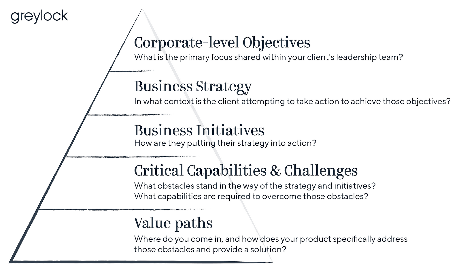 Effective research is pivotal in any value-based sale. Achieving a nuanced understanding of the customer is just as crucial as comprehending your own product. To streamline and optimize this research process, Greylock and others offer a valuable framework called the ‘value pyramid’ to their portfolio companies. Employing a top-down approach, this framework serves as a guide to unravel corporate-level objectives set by the CEO, influencing decisions throughout the organization. Additionally, it functions as an educational tool for your customer contacts, often positioned lower in the organizational hierarchy. This tool empowers them to advocate for and defend your solution to their superiors, utilizing language that resonates with each stakeholder’s preferences and priorities.