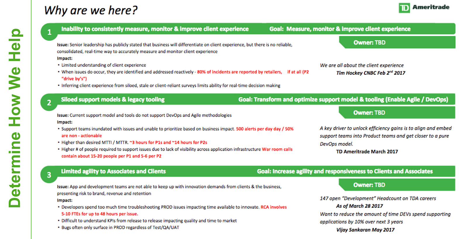 These are corporate objectives — the cornerstone of value-based selling because it directly ties to the EB’s goals and decision criteria. A product or service that delivers substantial improvement to the client experience, at a reasonable return on investment, will be more likely approved than one under a different banner. Now that we understood the corporate objective, the subsequent tier of the Value Pyramid focused us into strategies and initiatives. Publicly available information again granted us valuable insights into how the CIO, Vijay Sankaran, was actively aligning the priorities of his organization with those of Mr. Hockey.