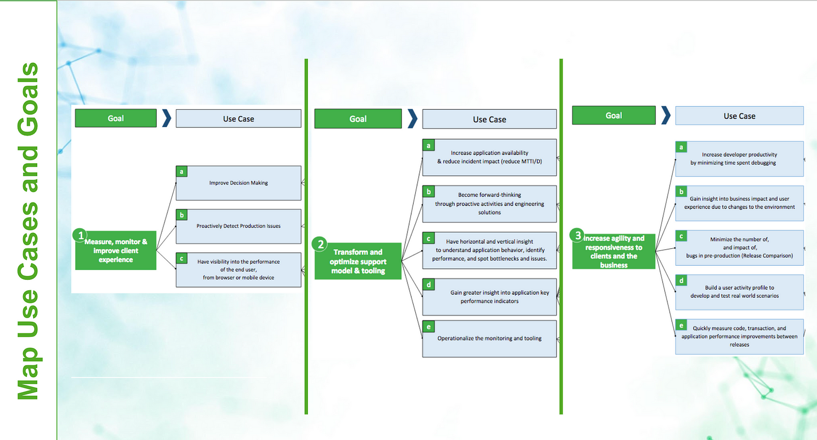 The technical evaluation plan is aligned to the resolution of use cases, mapped to business goals.